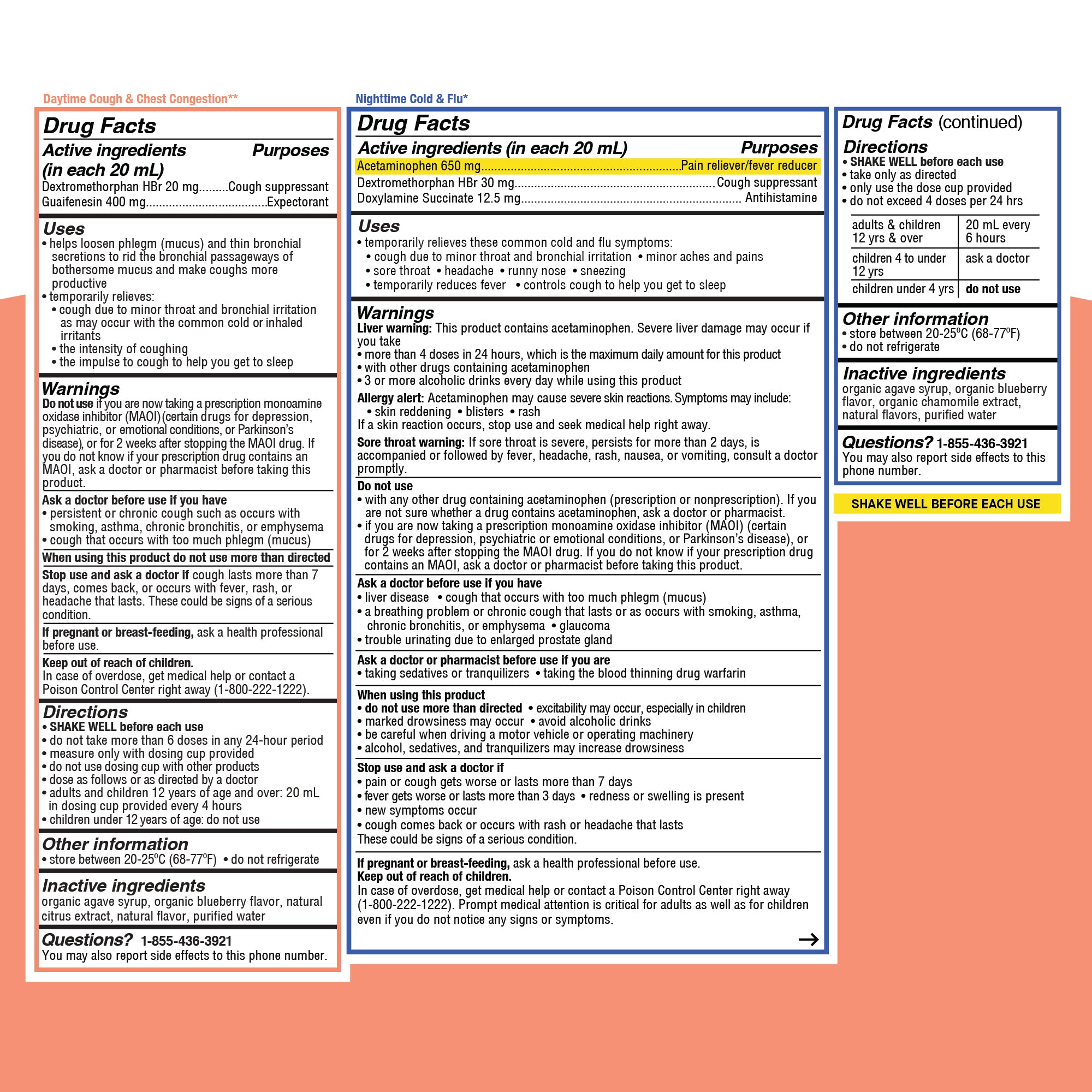 Daytime cough & chest congestion + nighttime cold & flu relief combo pack made with delicious organic blueberry flavor.
